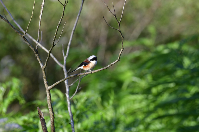 The bay-backed shrike is smaller in size compared to the long-tailed shrike. It has a dark face and a pure white throat. It has rufous sides and back.